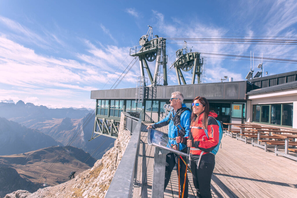 Bei der Ankunft der Seilbahn, die vom Pordoijoch (2239 Meter) zum Sass Pordoi (2950 Meter) hinaufführt, befindet sich die Marienhütte mit ihrer berühmten Terrasse der Dolomiten.