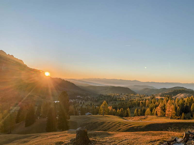 Gleich hinter dem Pass verbirgt sich der Karersee, ein kleines Dolomitenjuwel direkt unter den Hängen des Latemars, dessen imposante Gipfel sich im kristallklaren Wasser des Beckens spiegeln. Weit in der Ferne können Sie eine Blick auf das Grand Hotel Carezza erhaschen, eine imposante Struktur, die berühmte Persönlichkeiten wie Prinzessin Sissi, Winston Churchill und Agatha Christie beherbergte, die diesen Ort als Kulisse für ihre Romane „Poirot“ und „Die Großen Vier“ wählte.