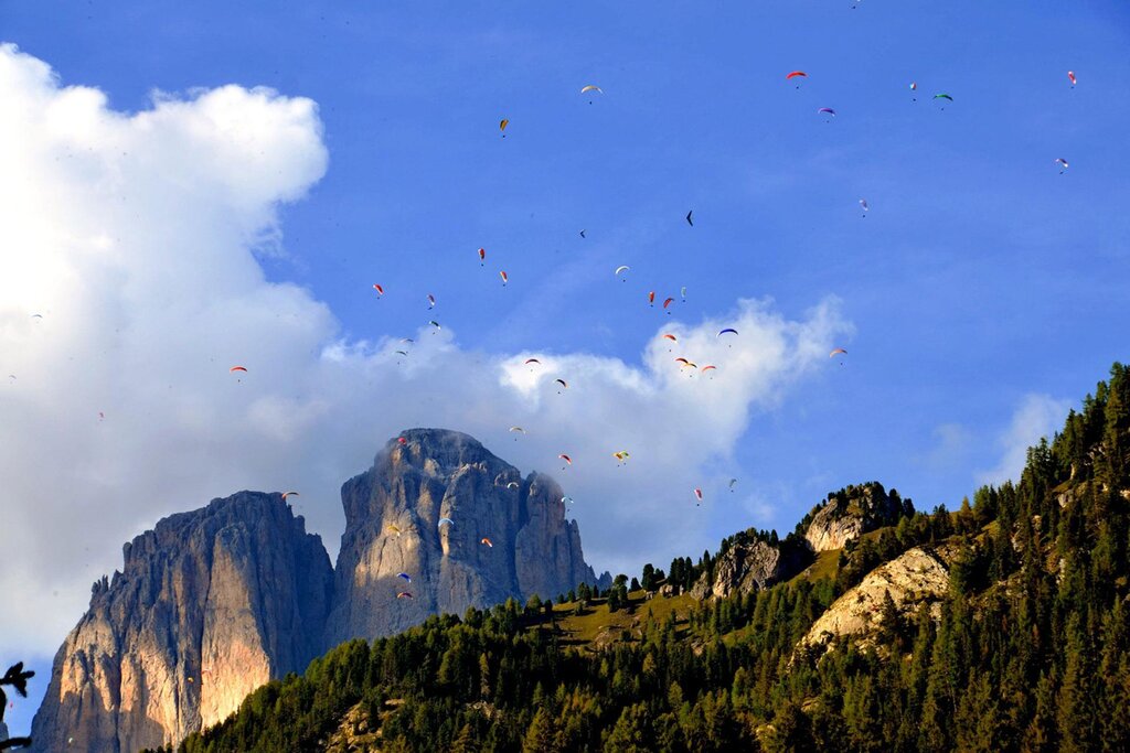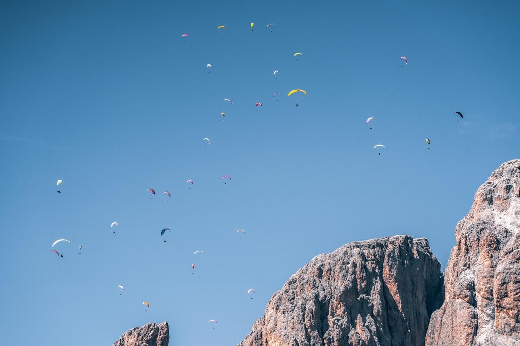 Die eigene Kappe in den schönsten Bergen der Welt im Fassatal aufzuziehen, ist ein unvergessliches Erlebnis. Über die Wolken steigen, den Plattkofel, den Langkofel und den Rosengarten überfliegen oder sogar auf der Marmolata landen - all das ist dank der präzisen Kenntnis des Geländes und der Windsysteme sowie der Expertise erfahrener Profis möglich, die ihr Wissen mit Enthusiasten aus der ganzen Welt teilen. Es gibt viele Start- und Landeplätze in den Dolomiten des Fassatals, doch die beliebtesten sind der Col Rodella oberhalb von Campitello und das Belvedere von Canazei - zwei spektakuläre Panoramaspots. Besonders von Ende September bis Anfang Oktober herrschen hier dank eines einzigartigen Mikroklimas, das durch Hochdruckbedingungen begünstigt wird, optimale Flugbedingungen.